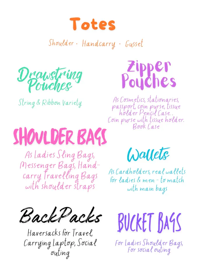 We design and make custom handmade bags. We either outsource their production or personally hand-sew it ourselves!
